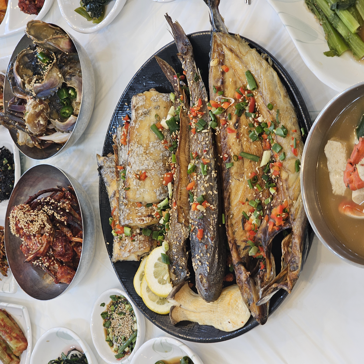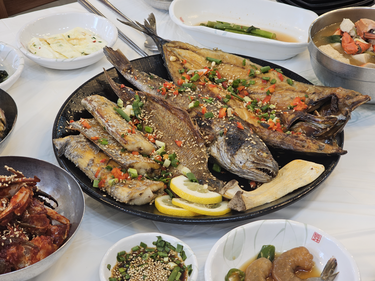 - 생선구이 3종 + 돌게장 정식 (1인 25,000원): 계절에 따라 가장 맛있는 생선으로 구성이 바뀌며, 제가 방문한 날에는 고등어, 민어, 갈치가 제공되었습니다. 겉은 바삭하고 속은 촉촉하게 구워낸 생선구이 3종의 고소한 맛이 일품입니다. 여기에 간장 돌게장과 양념 돌게장이 함께 나와, 다채로운 바다의 맛을 한자리에서 경험하고 싶은 분들께 최고의 선택이 될 것입니다.