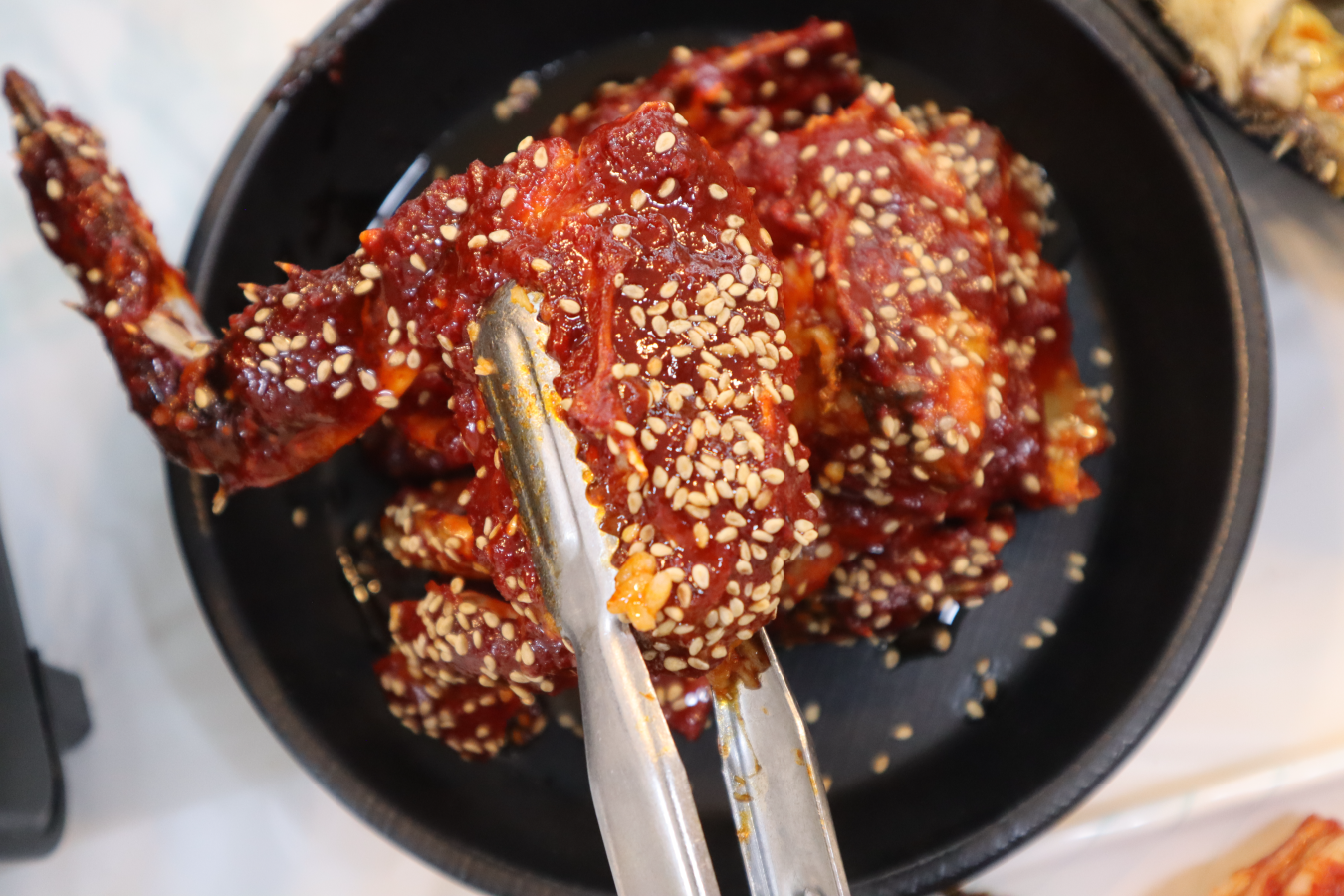 여수 현지인 맛집 청정게장촌의 양념 돌게장은 간장게장과는 또 다른 결의 매력을 보여줍니다. 무작정 맵기만 한 것이 아니라 다채로운 양념이 조화롭게 어우러져 깊이 있는 맛을 냅니다. 따뜻한 밥과 함께하면 매콤달콤한 양념이 밥알 사이사이에 스며들어 최고의 밥도둑이 되어줍니다. 선명한 붉은빛은 시각적으로도 식욕을 돋우며, 입안 가득 퍼지는 매콤함과 기분 좋은 단맛의 균형은 젓가락을 멈출 수 없게 만듭니다. 촉촉한 양념을 머금은 부드러운 게살의 풍미는 그야말로 일품입니다.